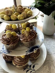 De afkølede muffins pyntes med smør/osteglasur og chokoladeæg