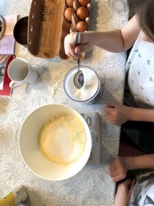 Ovnen tændes på 200 gr. Alle ingredienserne hældes i en skål og røres sammen. Dejen lægges i muffinsforme og bages i ca. 10-12 min. Start med lidt færre minutter og stik en kødnål ned det højeste sted på muffinen – hvis der følger dej med, skal muffinen have lidt mere.